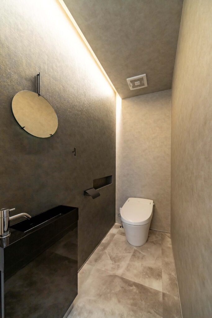 まず、和モダンテイストのトイレには、温かみのある電球色を中心に、間接照明やダウンライトを効果的に配置するのがおすすめです。障子のような和紙素材の照明器具や、木材を活かしたデザインを取り入れることで、落ち着きと品格のある空間を演出できます。光の陰影を意識することで、奥行き感も生まれ、より洗練された印象になります。
