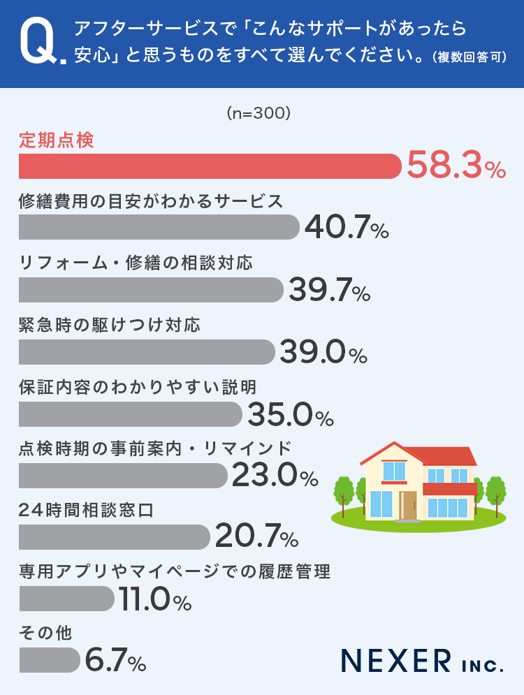 そこで今回は株式会社NEXERと共同で、事前調査で「住宅を購入した経験がある、または購入を検討している」と回答した全国の男女300名を対象に「住宅の長期保証・アフターサービス」についてのアンケートをおこないました。