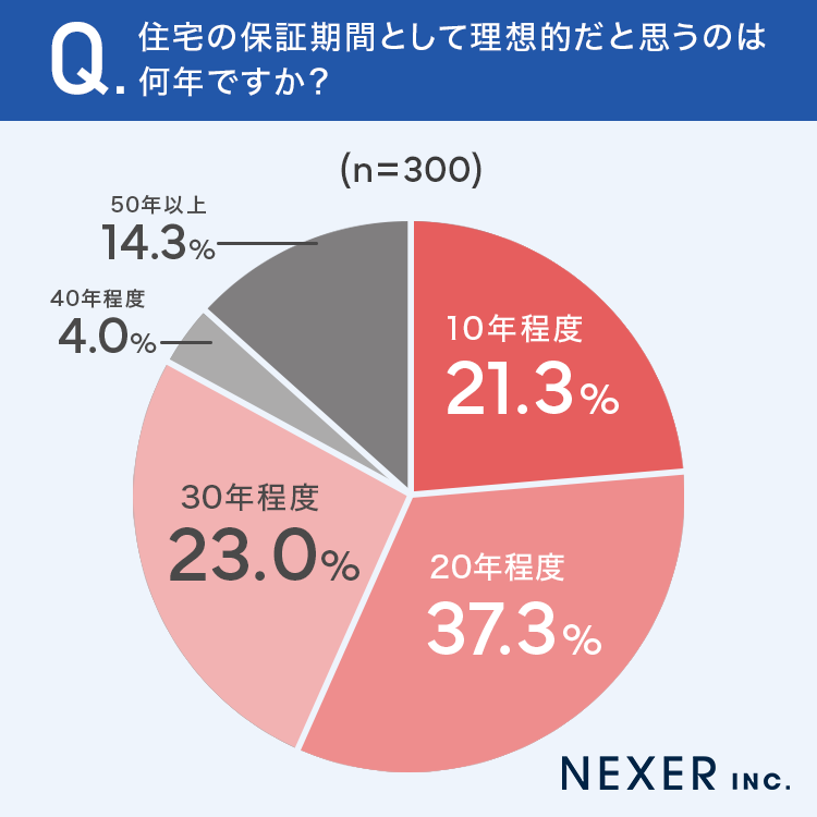 また「50年以上」と回答した人も14.3%おり、「40年程度」の4.0%を加えると、30年以上の長期保証を望む方は全体の約4割にのぼります。