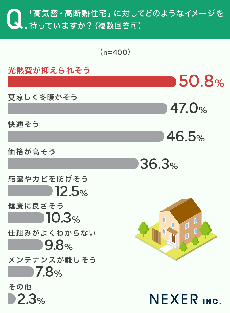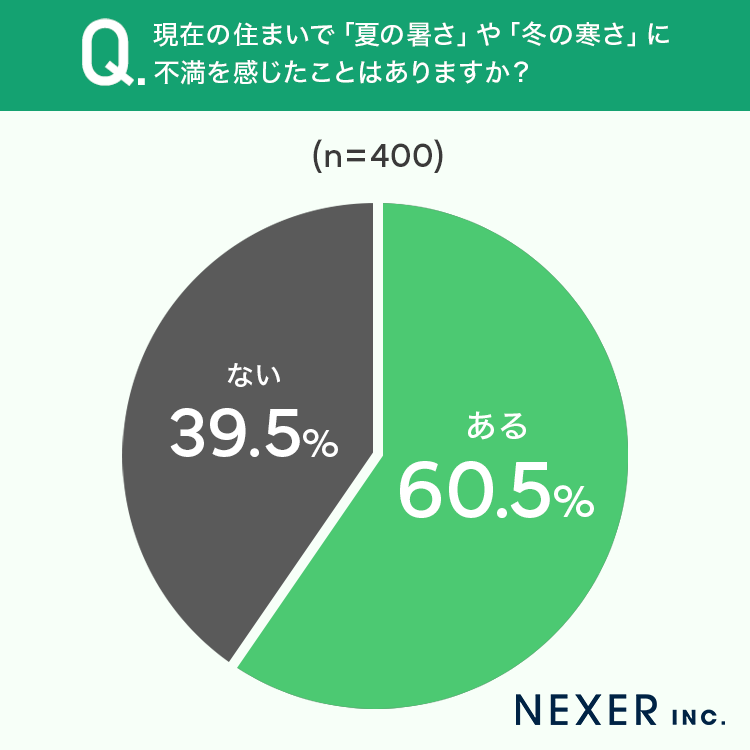 そこで今回は株式会社NEXERと共同で、事前調査で「現在一戸建ての持ち家に住んでいる」と回答した全国の男女400名を対象に「住宅の断熱性能・室内の快適性」についてのアンケート調査を実施しました。