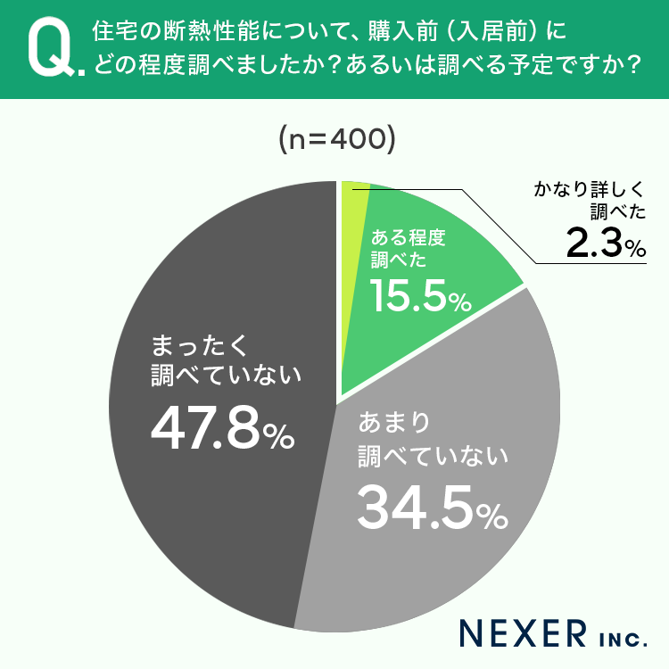 続いて、住宅の断熱性能について購入前(入居前)にどの程度調べたかについて聞いてみました。