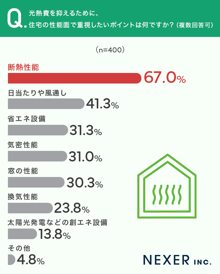 最後に、光熱費を抑えるために住宅の性能面で重視したいポイントについて聞いてみました。