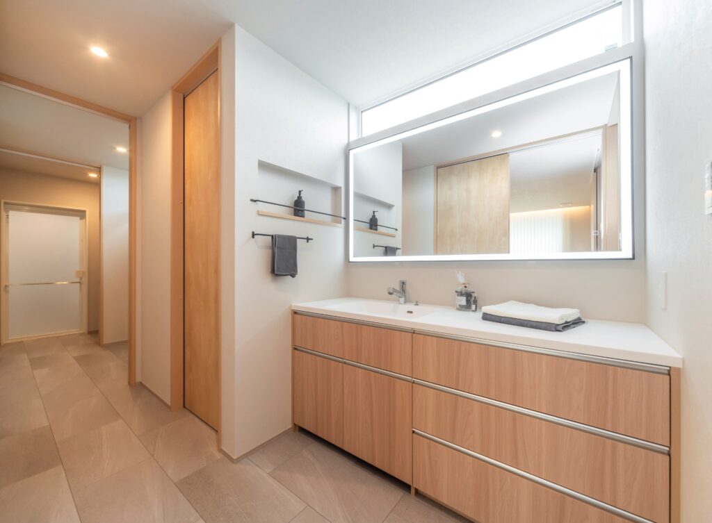一方、キッチンからランドリー、クローゼットを最短で結ぶ動線は、忙しい毎日の家事を劇的にスムーズにします。