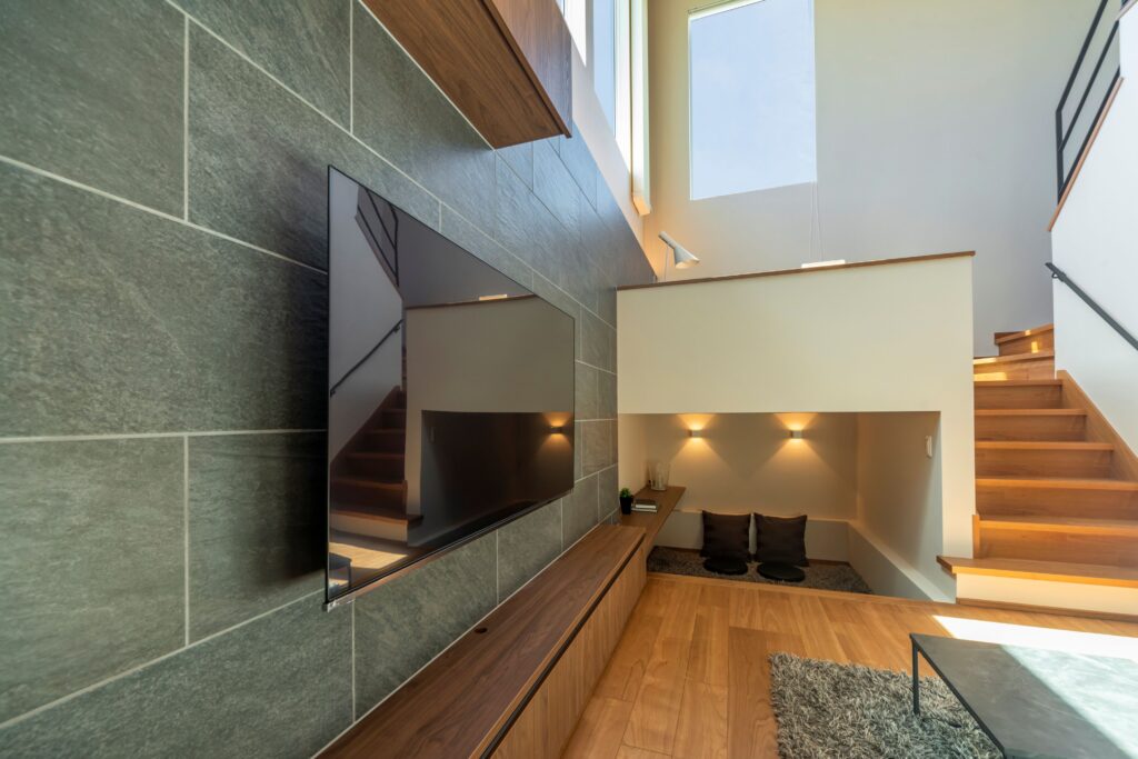 グレージュの落ち着いた色味と大きな窓のある吹き抜けが特徴です。