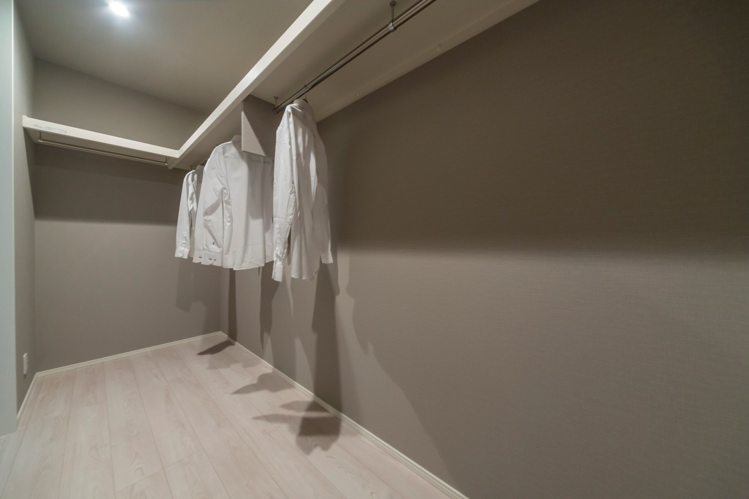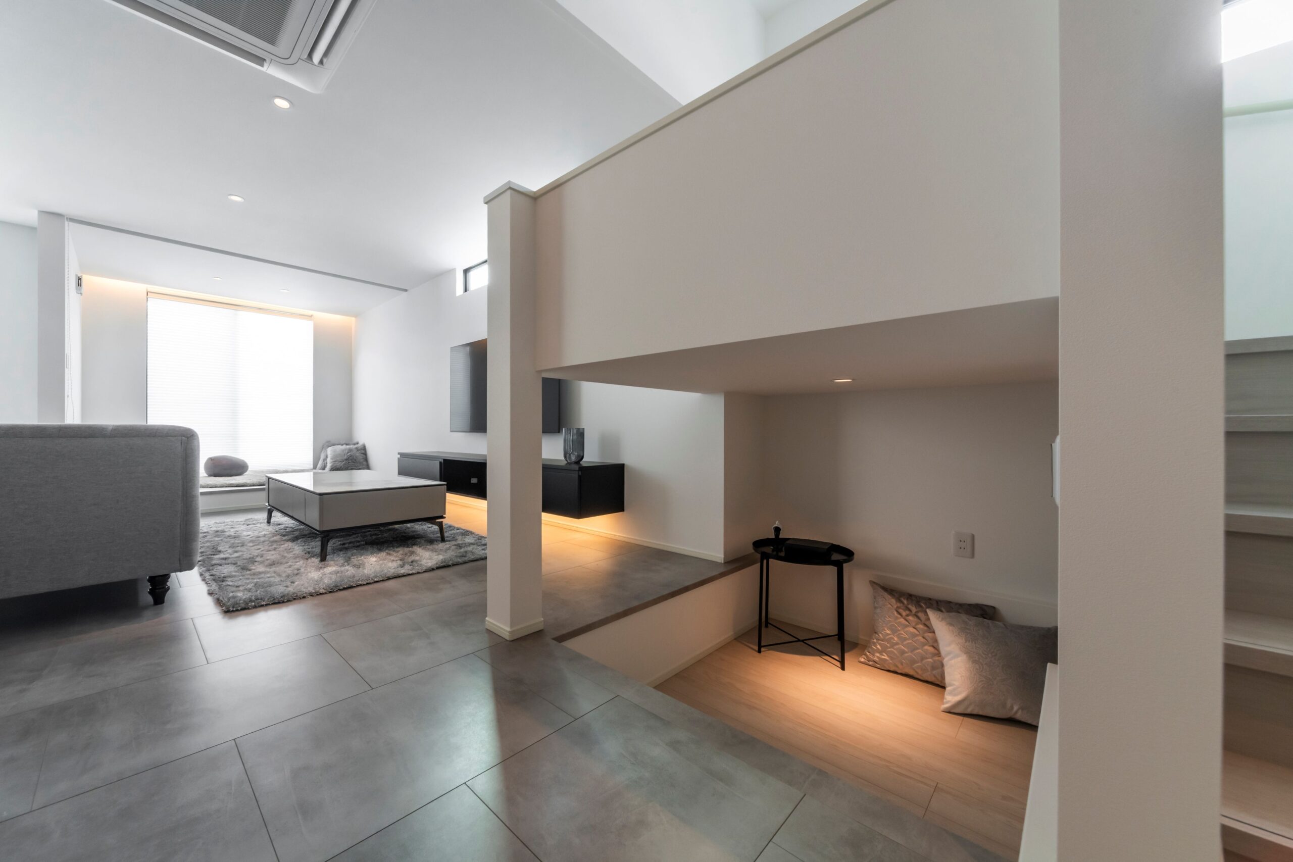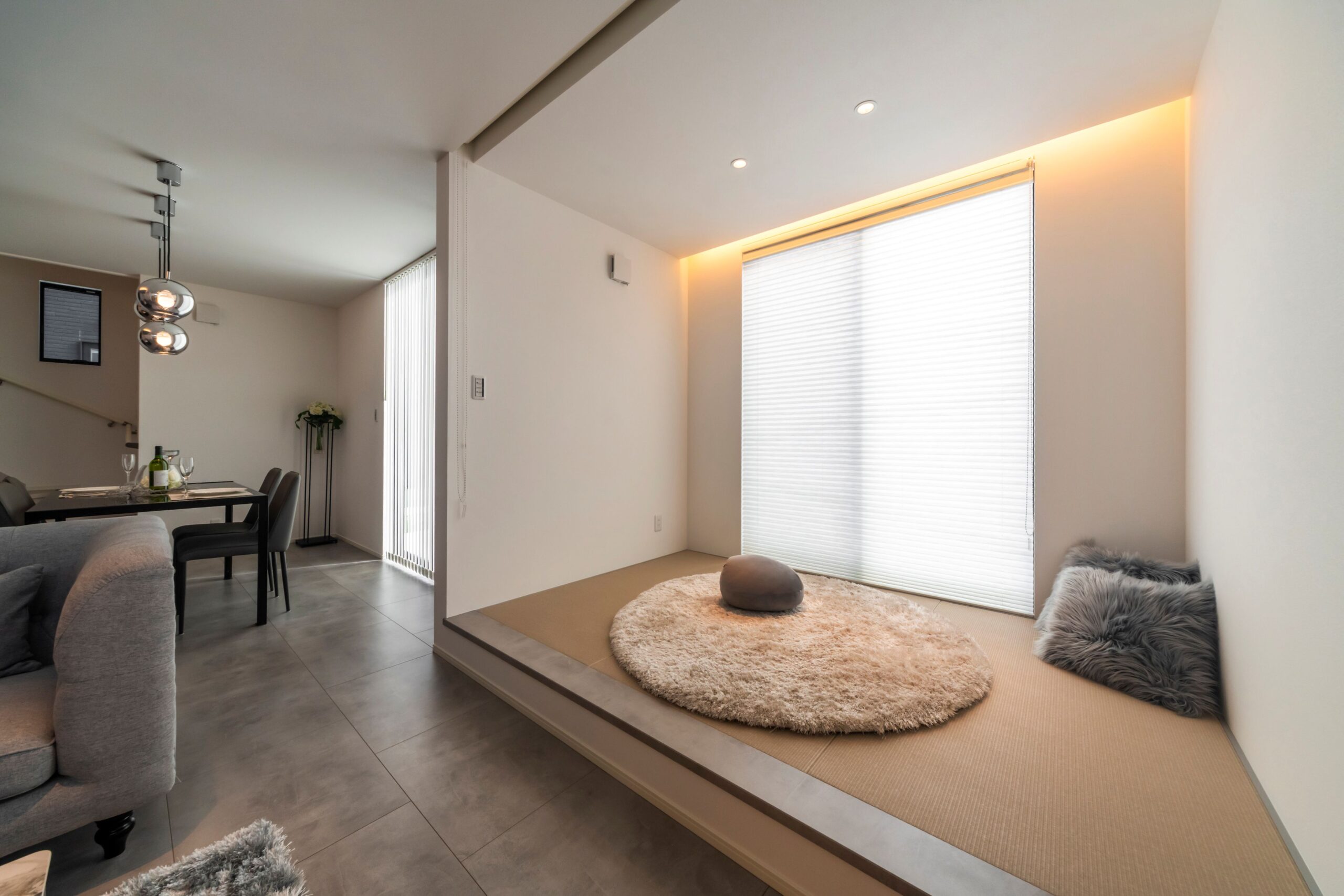 ホワイトを基調としたホテルライクな空間に、造作家具の気品が漂う住まい。最大の見どころは、LDKに設けた中二階のホビースペースと、その下の半地下空間です。家族の気配を感じつつ、遊びや趣味に没頭できる「縦の繋がり」をデザインしました。上下階に配置した3帖ずつのWクローゼットや、小上がりの畳コーナーなど、子育て世代の理想を凝縮。デザイン性と機能美をコスパ良く両立した、クオレ・ホームの提案力が光る一棟です。