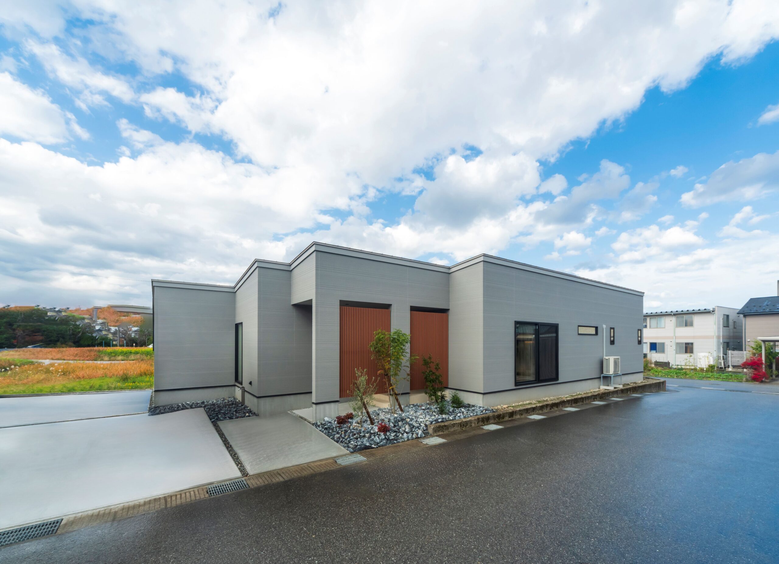 グレーで統一された落ち着いた外観。植栽が和の雰囲気を醸し出します。