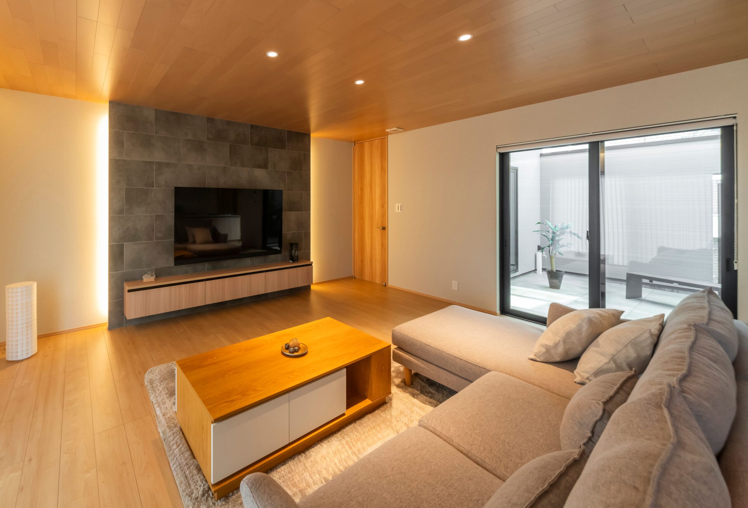 和の要素を取り入れた42坪のゆとりある邸宅。テラスを囲うコの字型の平屋で、光が入り込む明るい空間です。