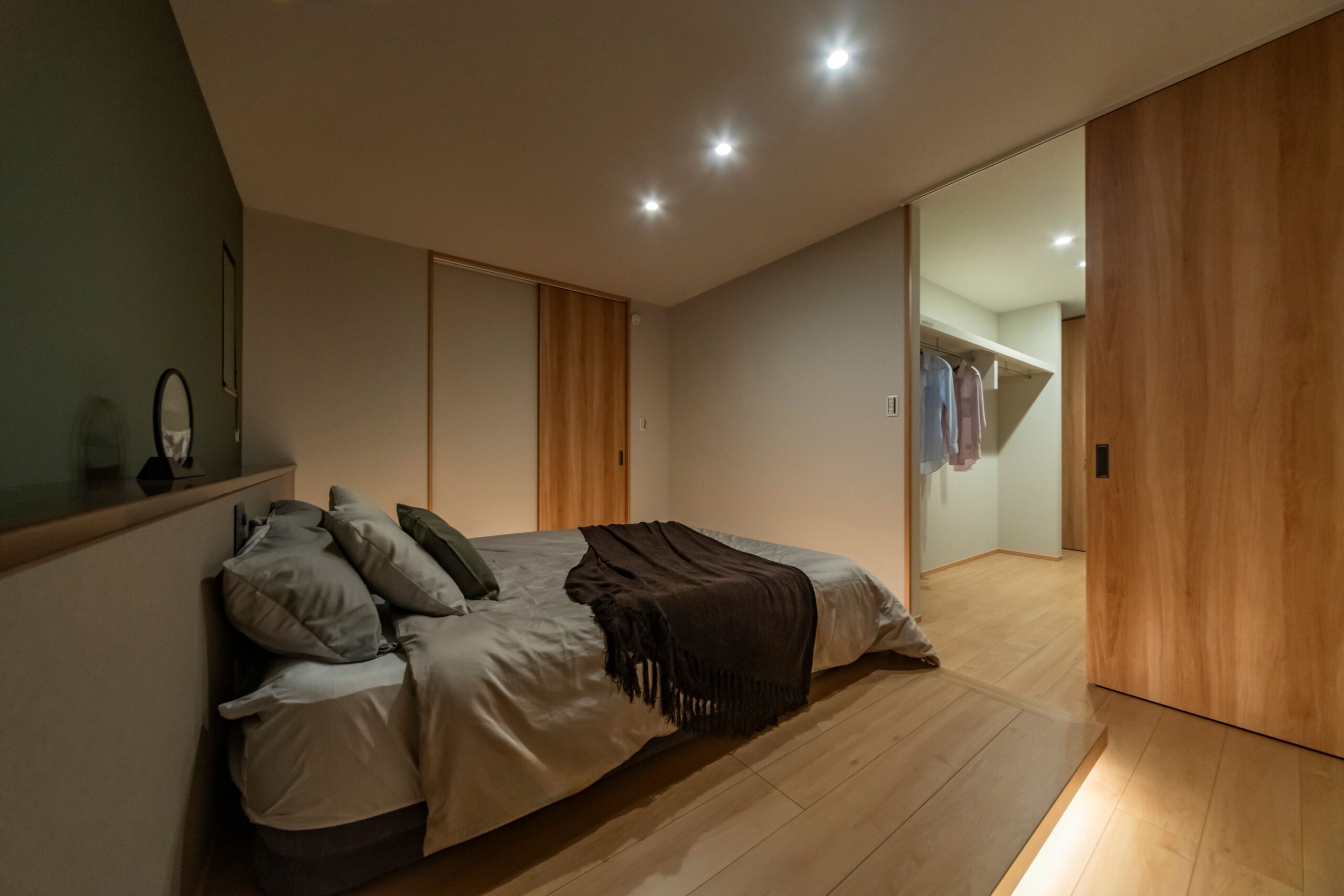 約8帖の寝室には小上がりを設けました。ファミリークローゼットから水回り、リビングへとつながる回遊動線になっています。