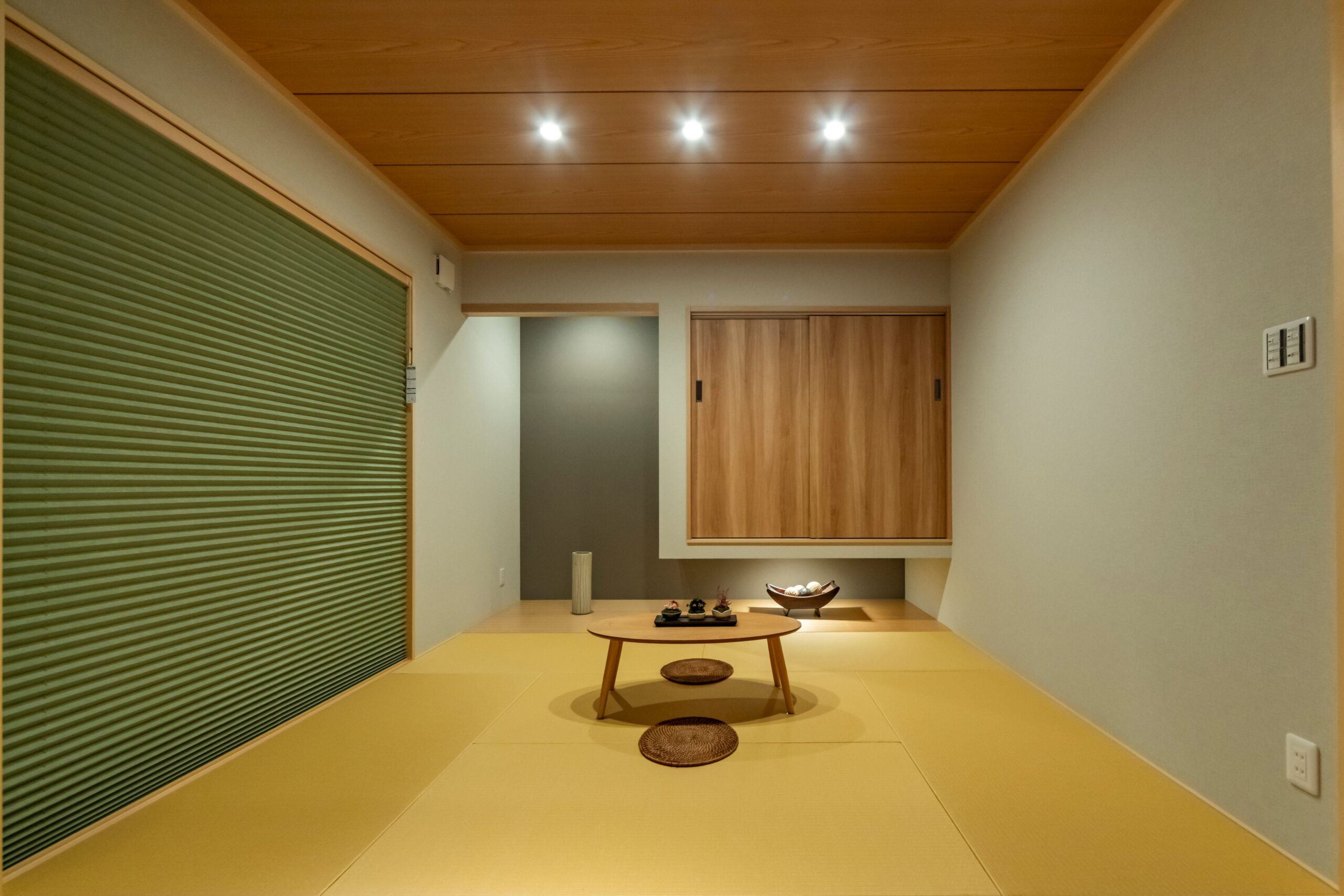 黄金色の畳と落ち着いたグリーンのブラインドが和の趣を感じさせます。ロールスクリーンで空間を仕切ることができ、客間として活用できます。