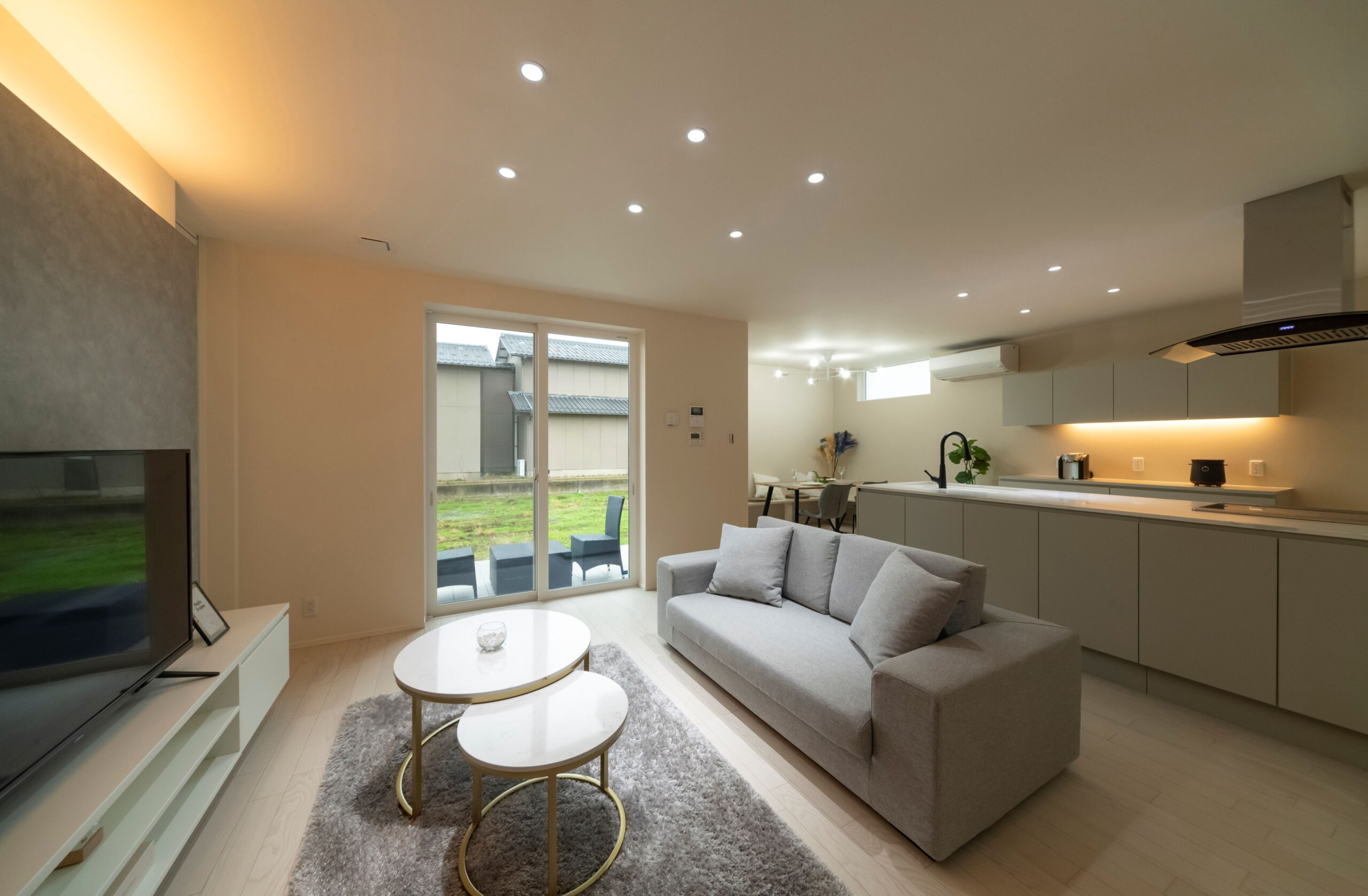白を基調とした明るいリビング。テレビステーションの間接照明で華やかな印象に。