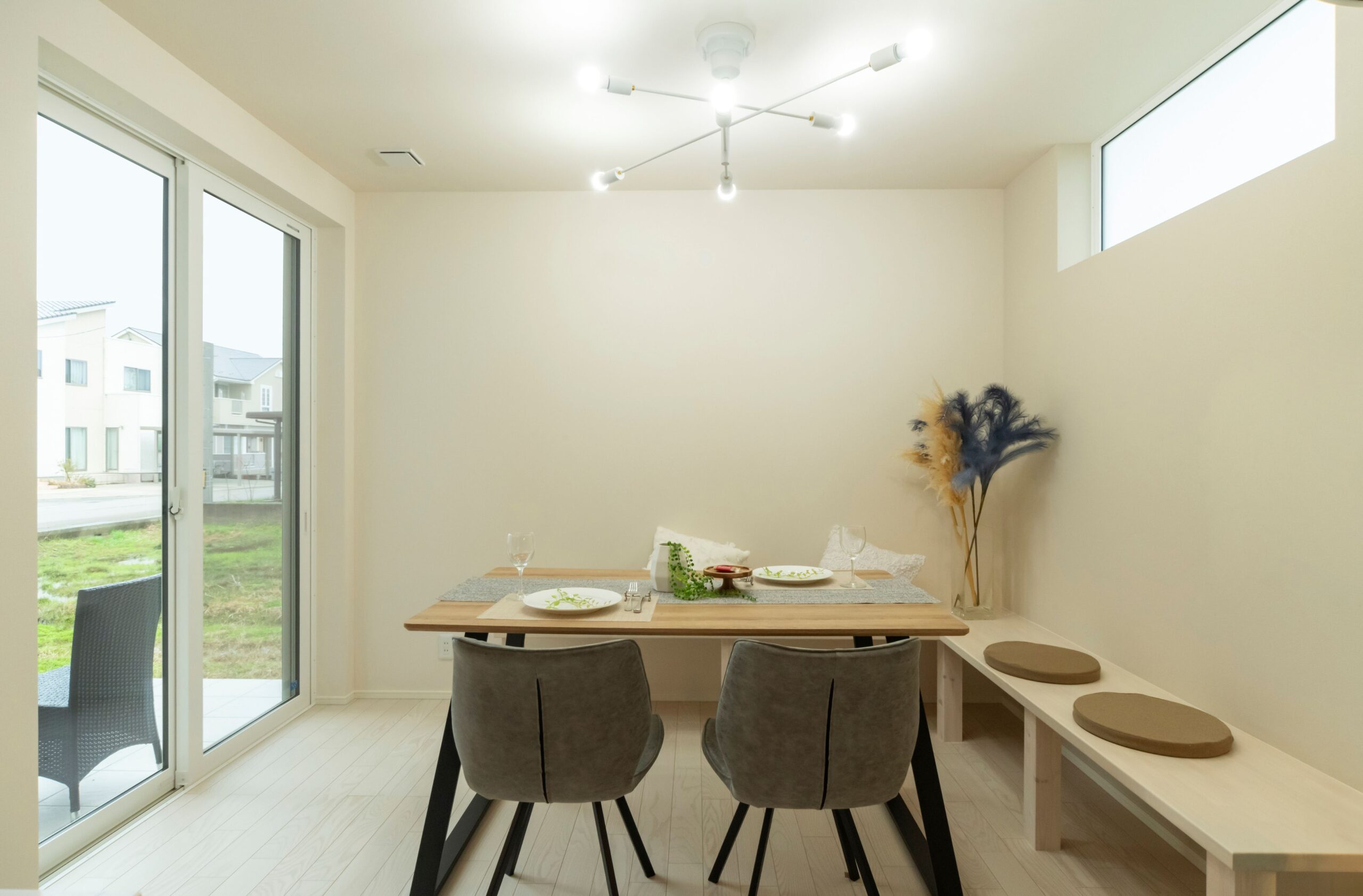 造り付けのベンチがあるダイニング。家族がくつろぐベンチです。