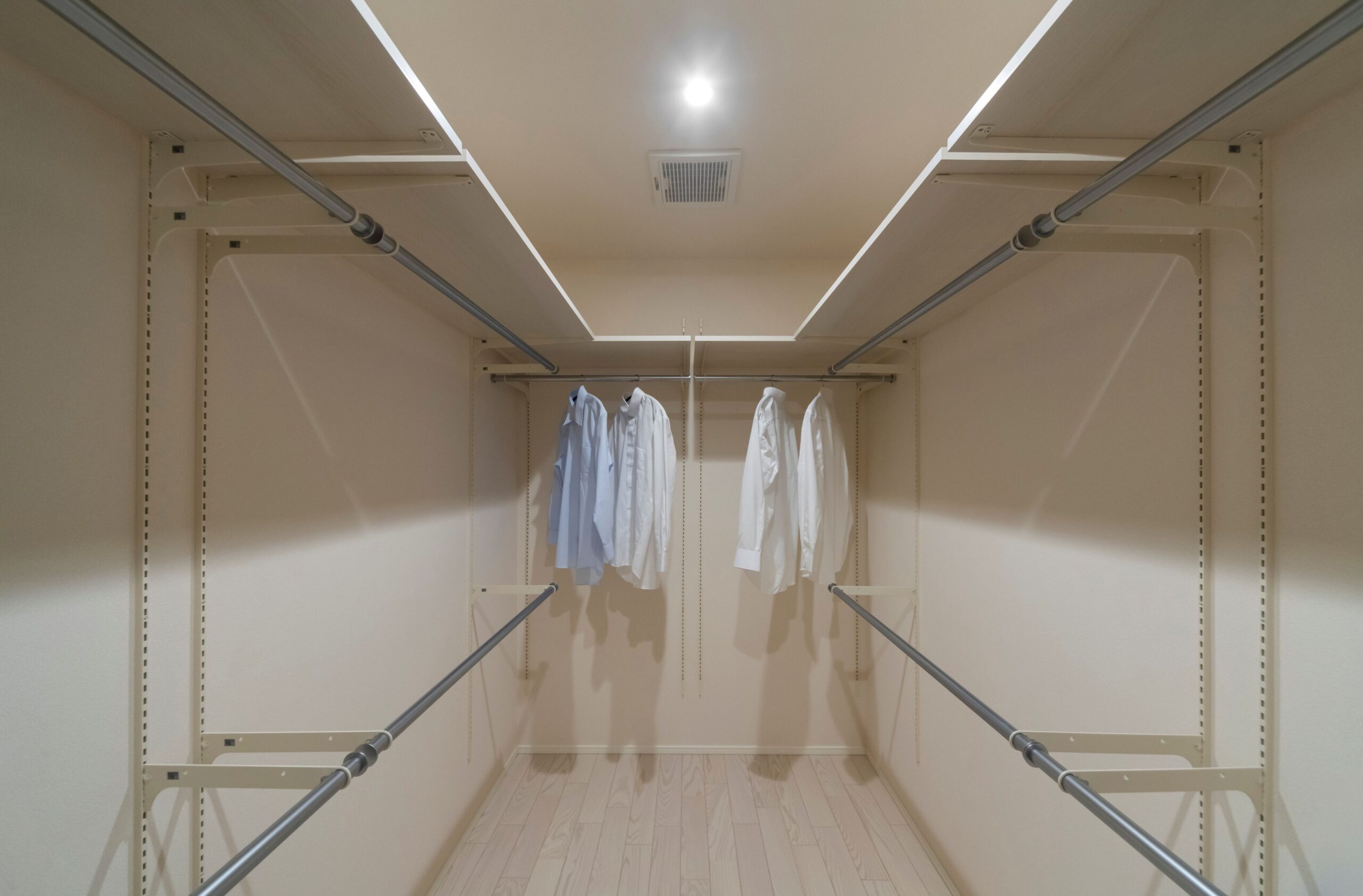 3帖の広々したファミリークローゼット。各部屋の収納をなくし、1階2階それぞれに設けたクローゼットに収納をまとめました。