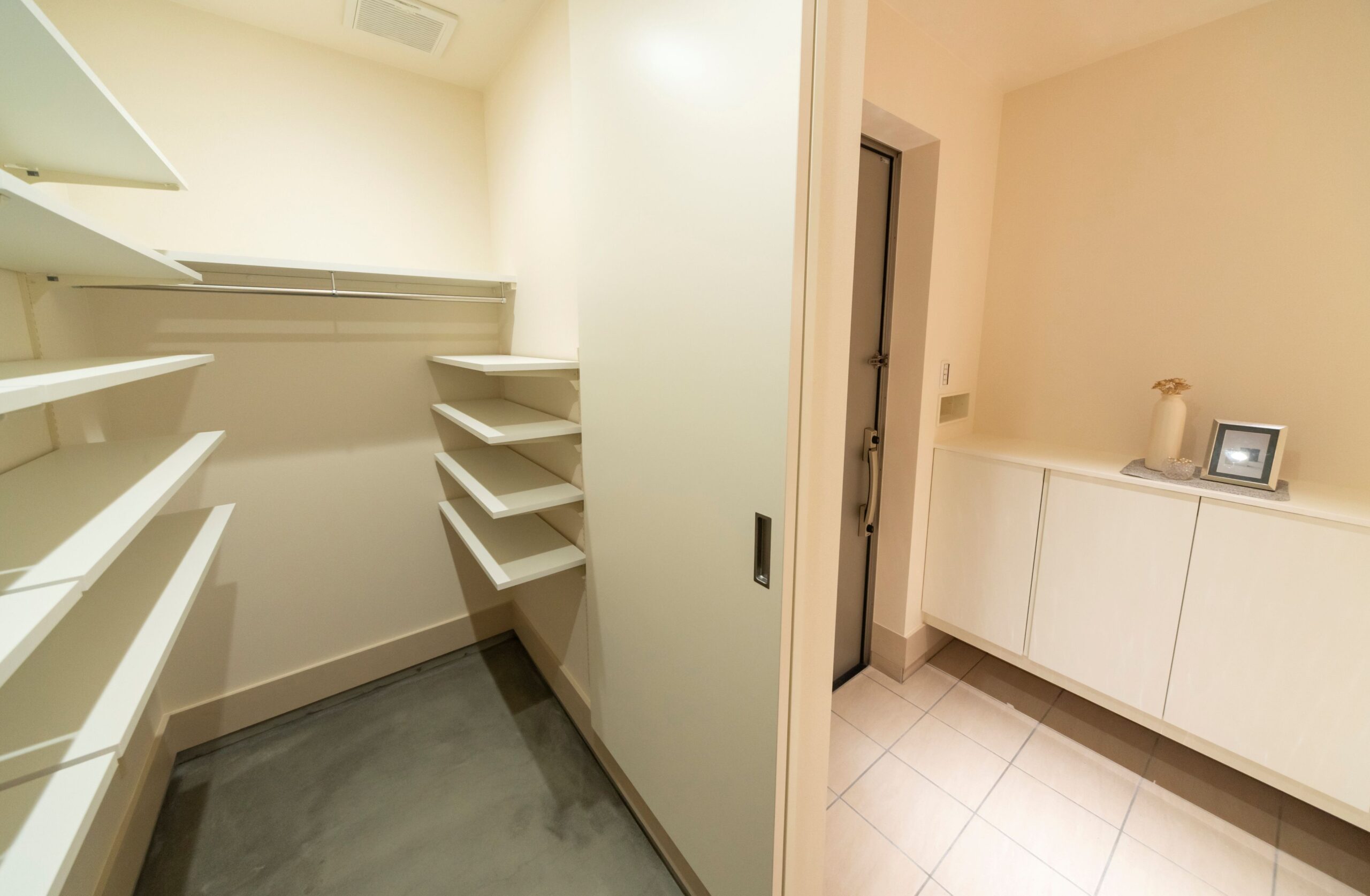 玄関にはウォークインのシューズクローゼットを設けました。可動棚を設置した使い勝手のいい収納です。