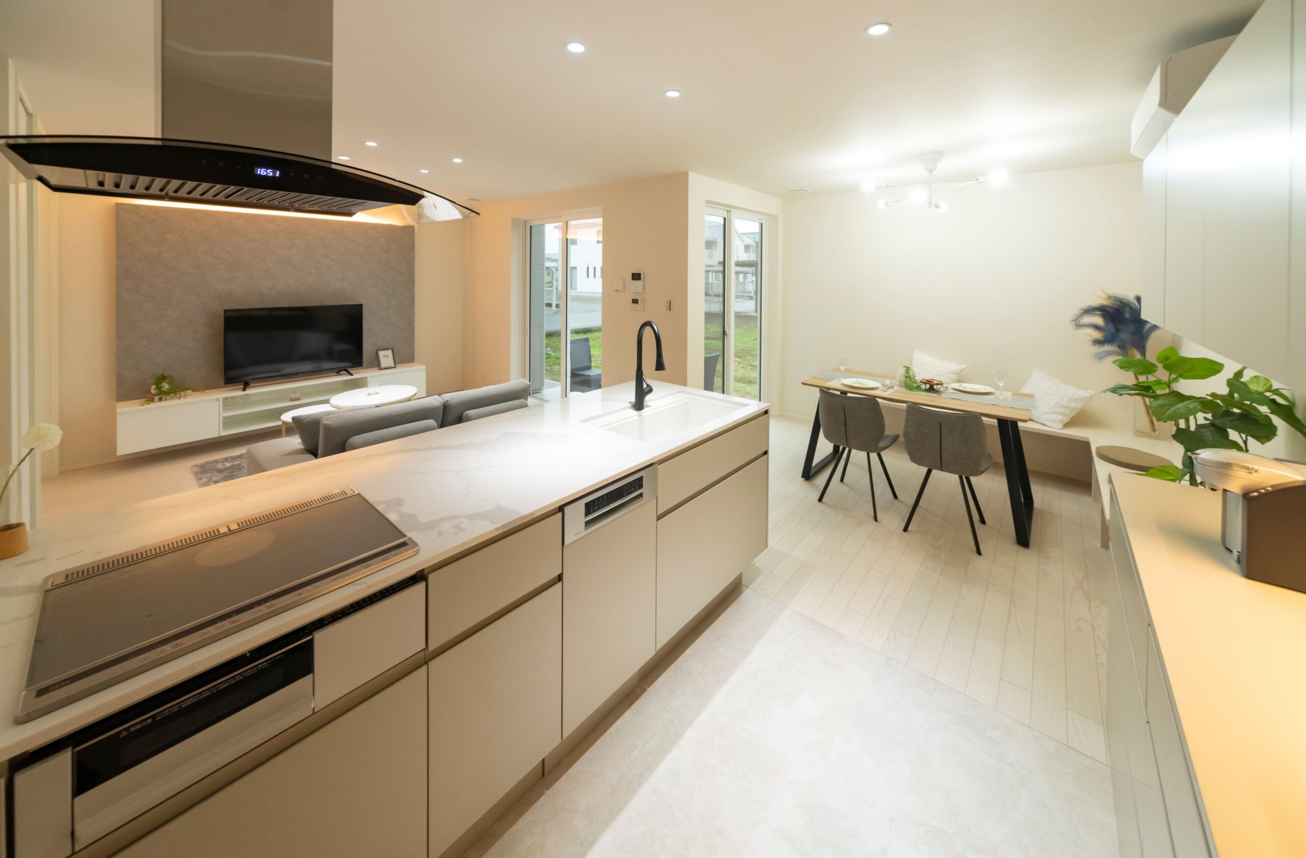 グレージュの造作キッチン。LDKを見渡す配置です。