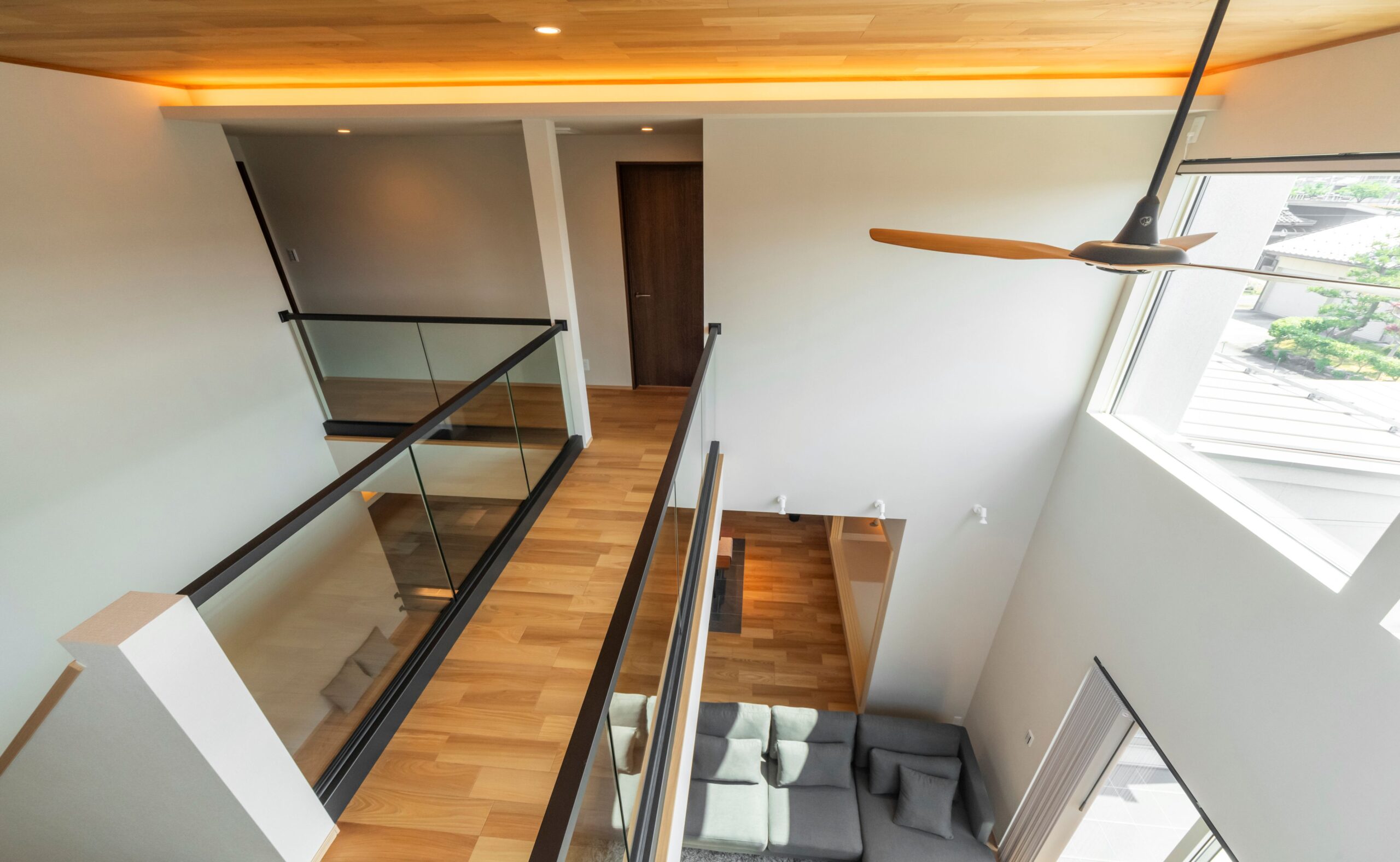 2階の廊下は吹き抜けを通るキャットウォーク。ガラスの手すりがより開放的な空間を演出します。