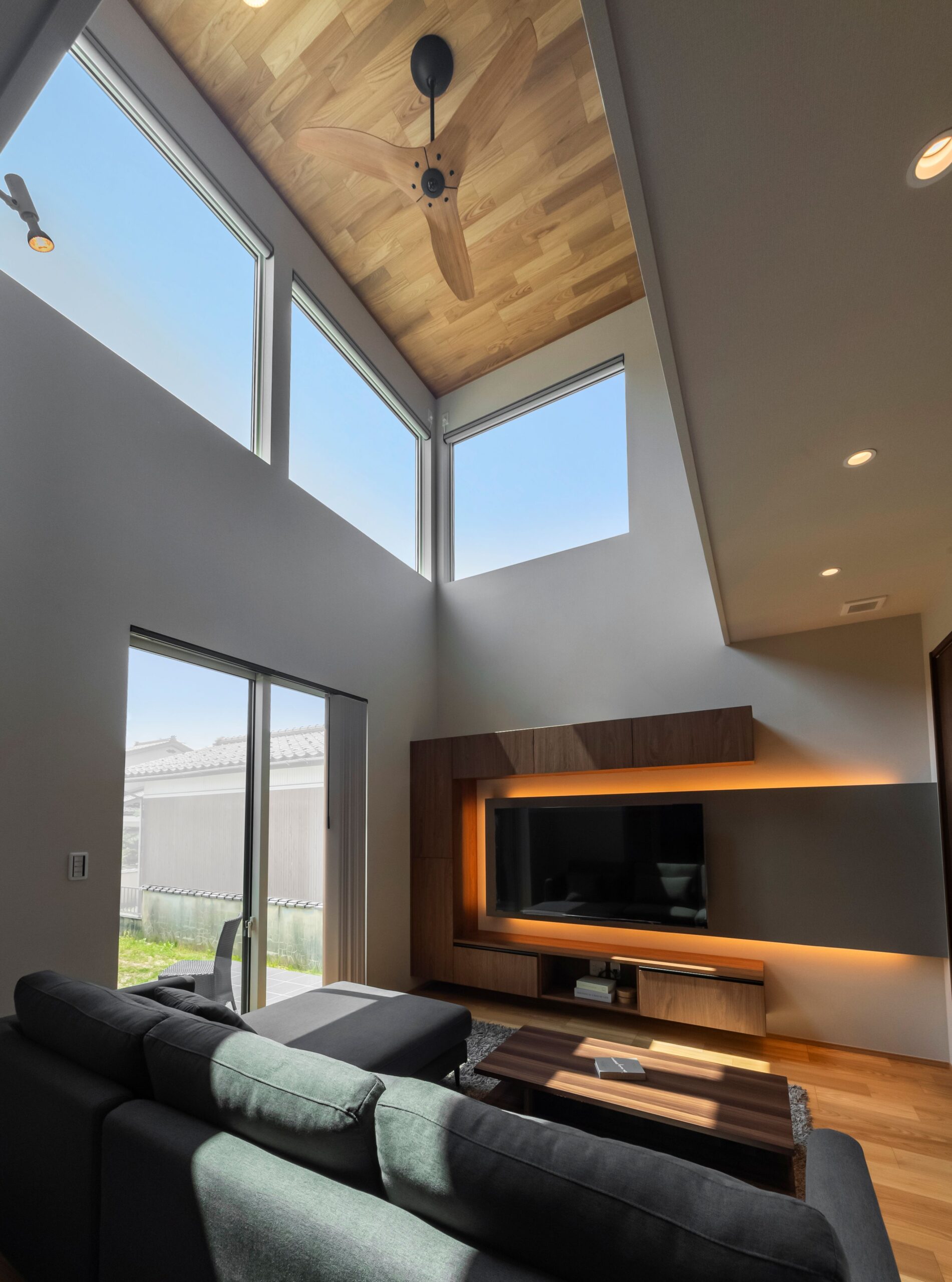 吹き抜けの大きな窓から温かな光が差し込むリビング。 天井を板張りにすることで高級感のある美しい空間に仕上がりました。