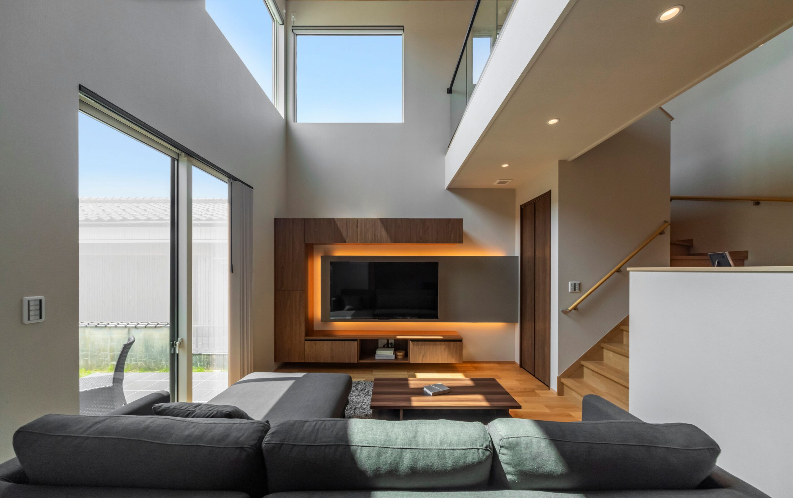 吹き抜けには大きな窓を設置。自然光が差し込む明るいリビングです。