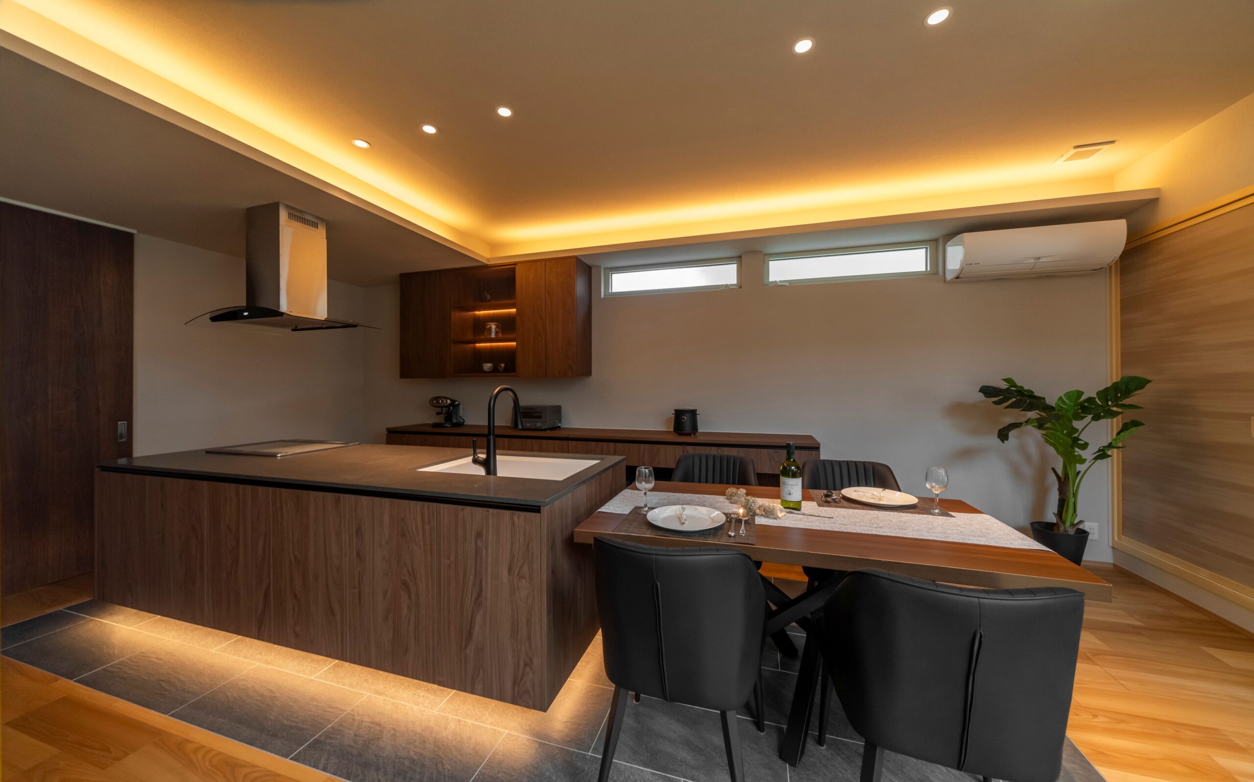 間接照明が映えるキッチン。ダイニングと横並びにすることで配膳の際の動線がスムーズです。