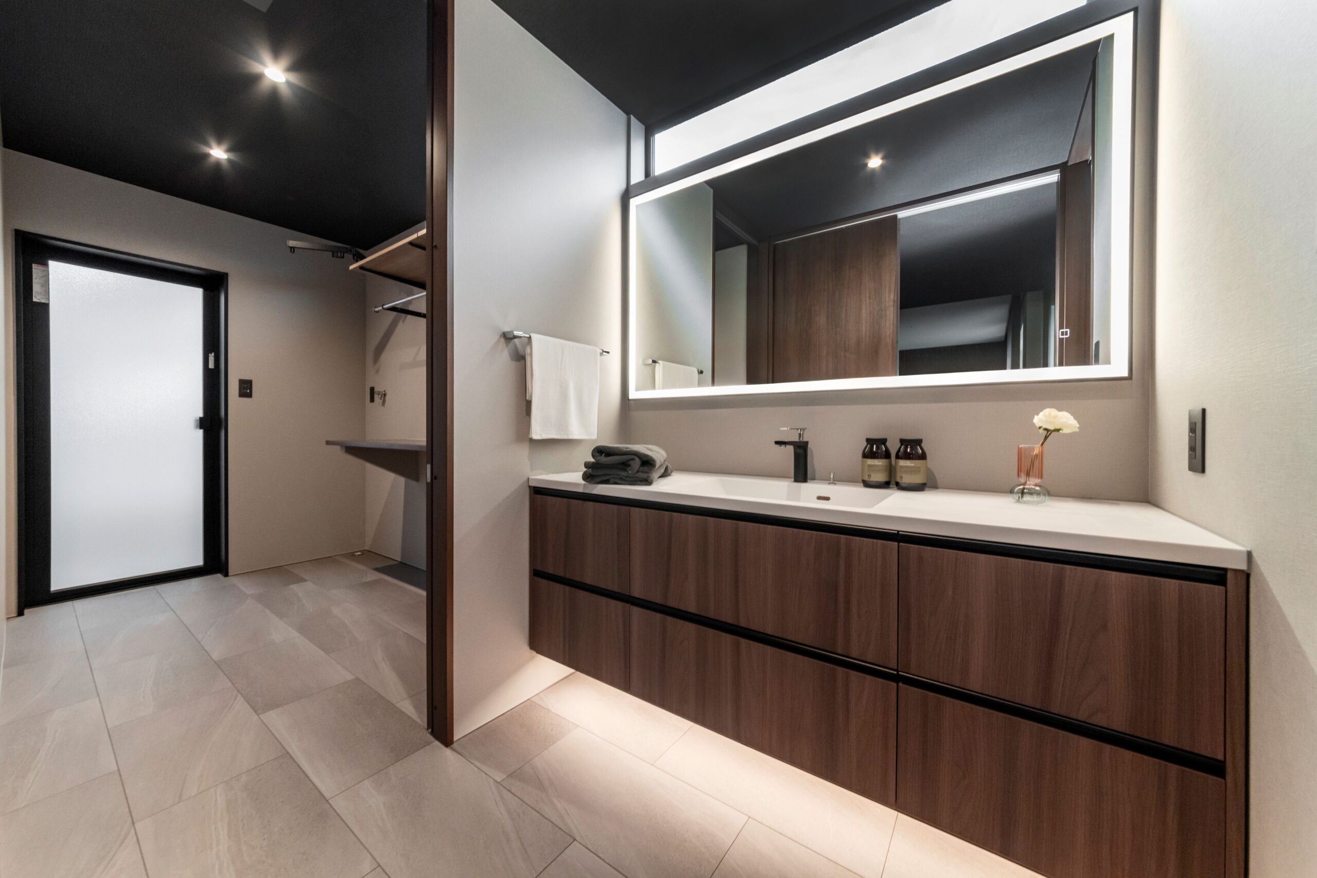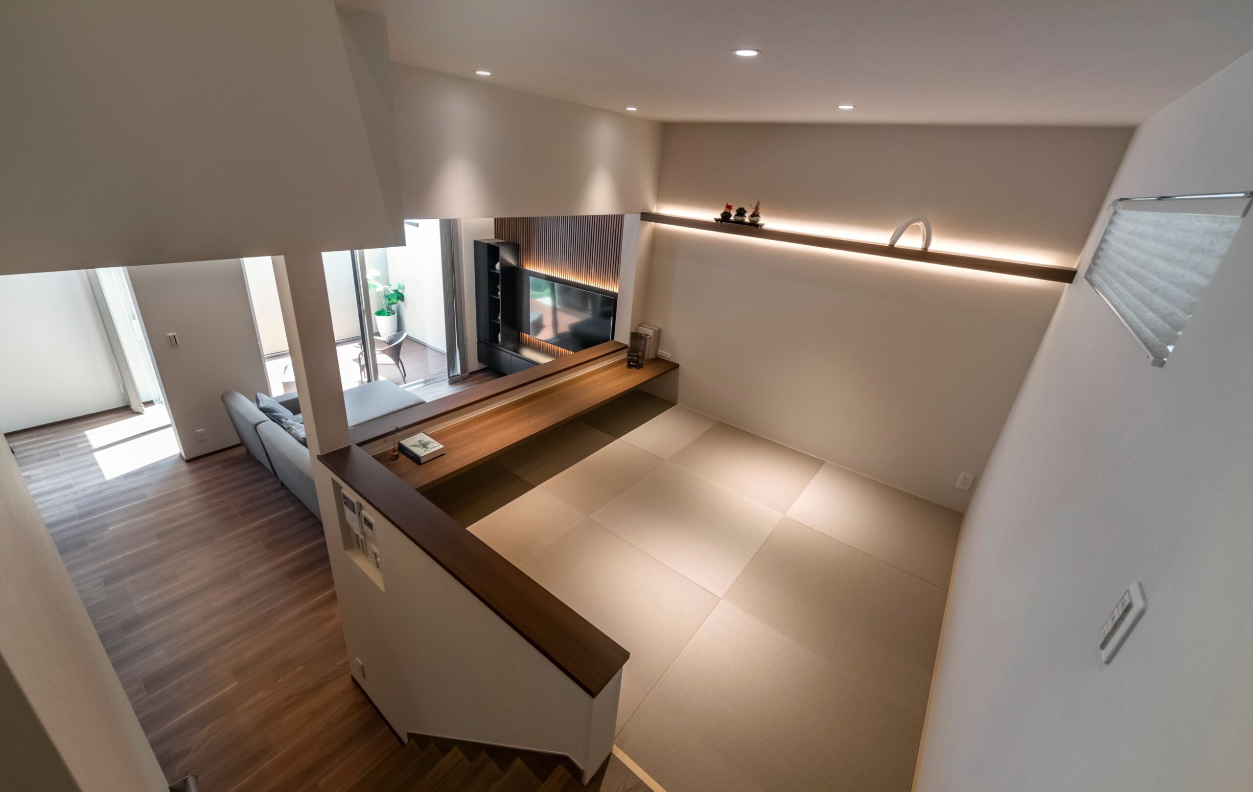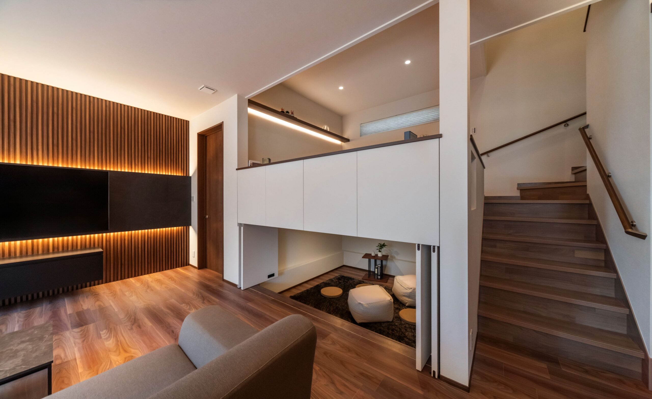 海外のトレンドを取り入れたブラックトーンの邸宅。随所に間接照明を取り入れることで高級感のある空間に仕上がりました。 スキップフロアは畳を用いた特別な空間。おしゃれだけど落ち着く空間です。