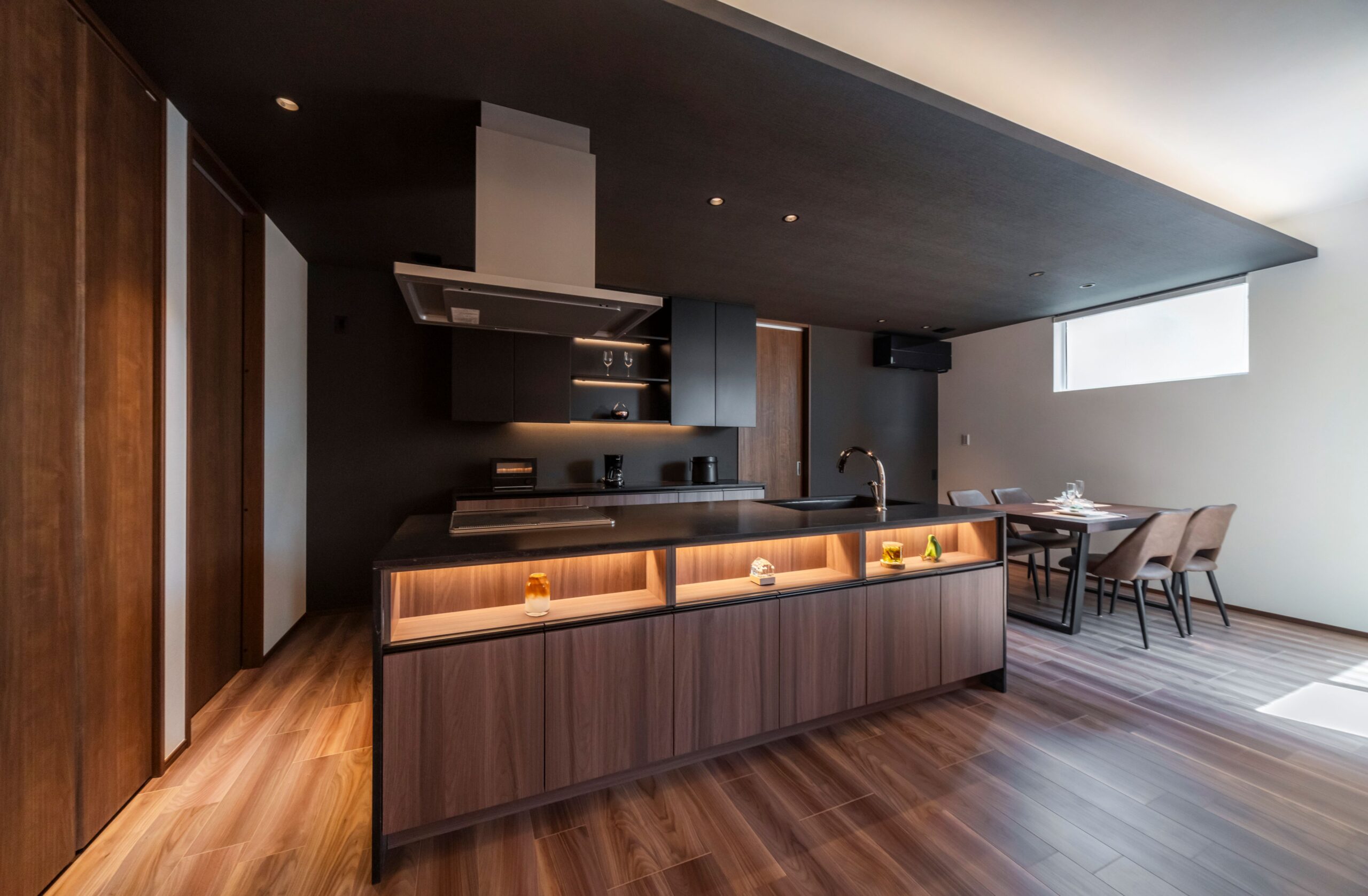 ブラックでまとめた造作キッチン。背面には飾り棚を設けました。