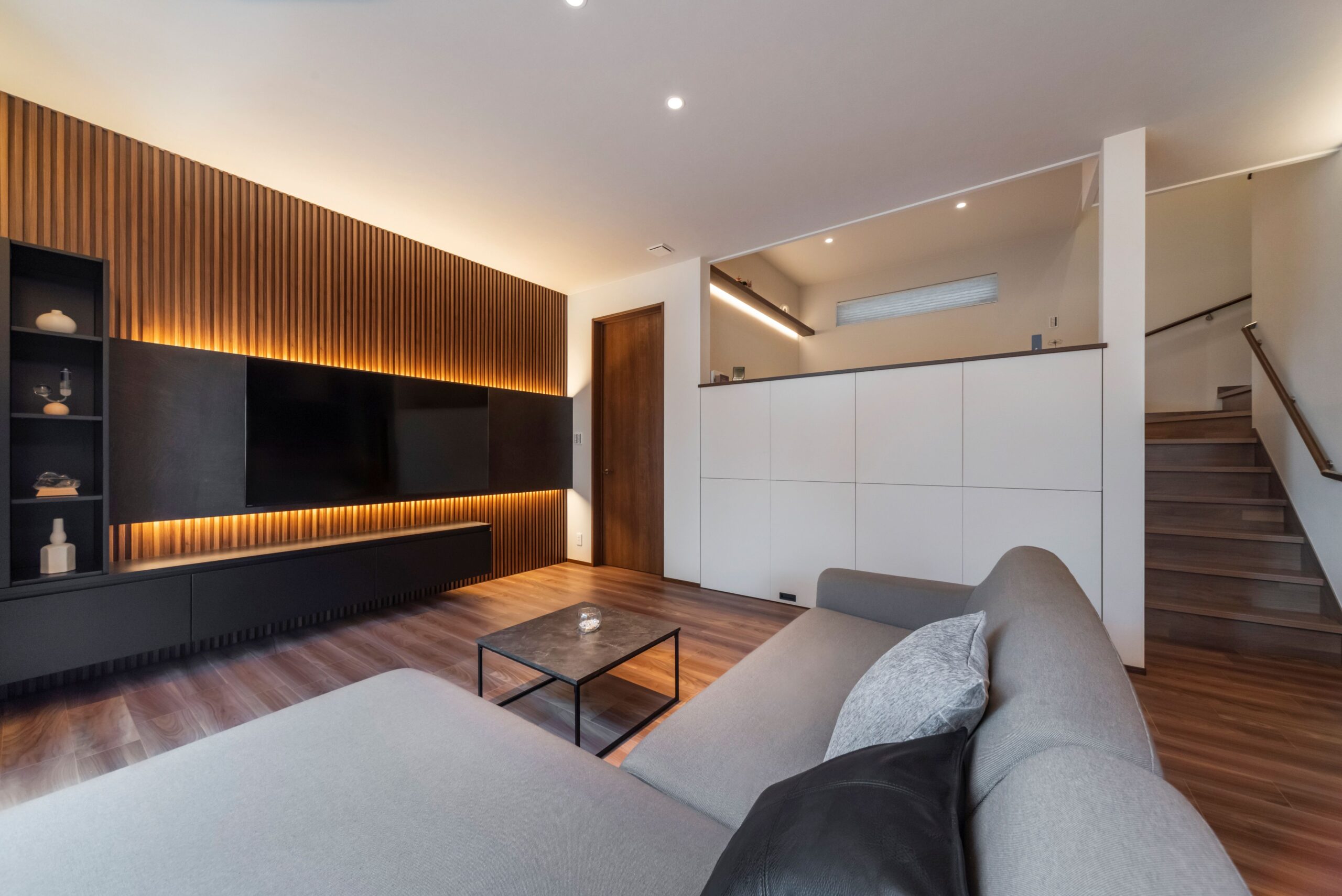 シックなトーンでまとめたリビング。間接照明が美しいテレビボードが空間に奥行と高級感を演出します。