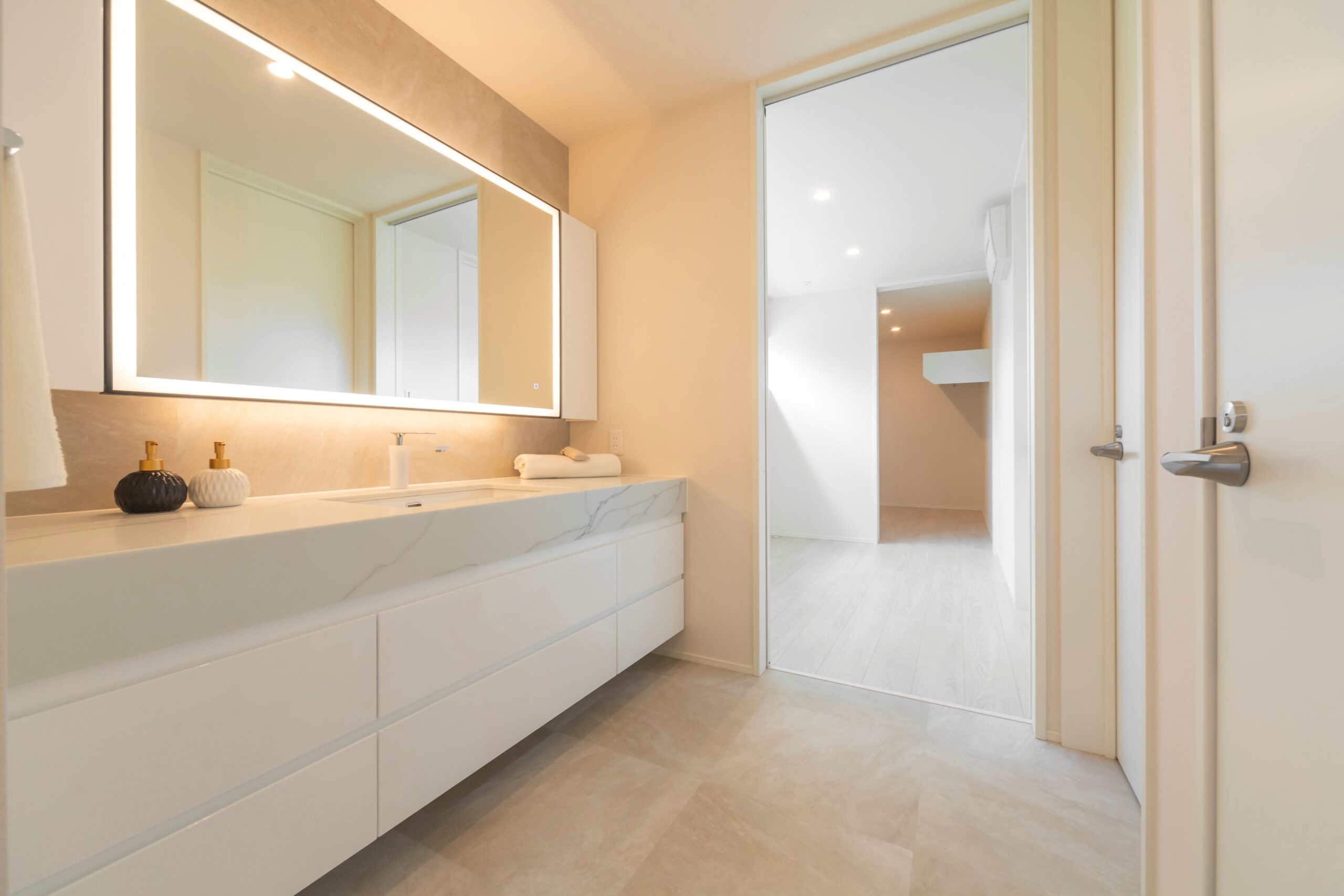 ホワイトベースで統一された清潔感のある空間です。マーブル調の洗面台とストーン調の壁面タイル、そこを照らす間接照明が空間に高級感をもたらし、ホテルのような印象に仕上がっています。