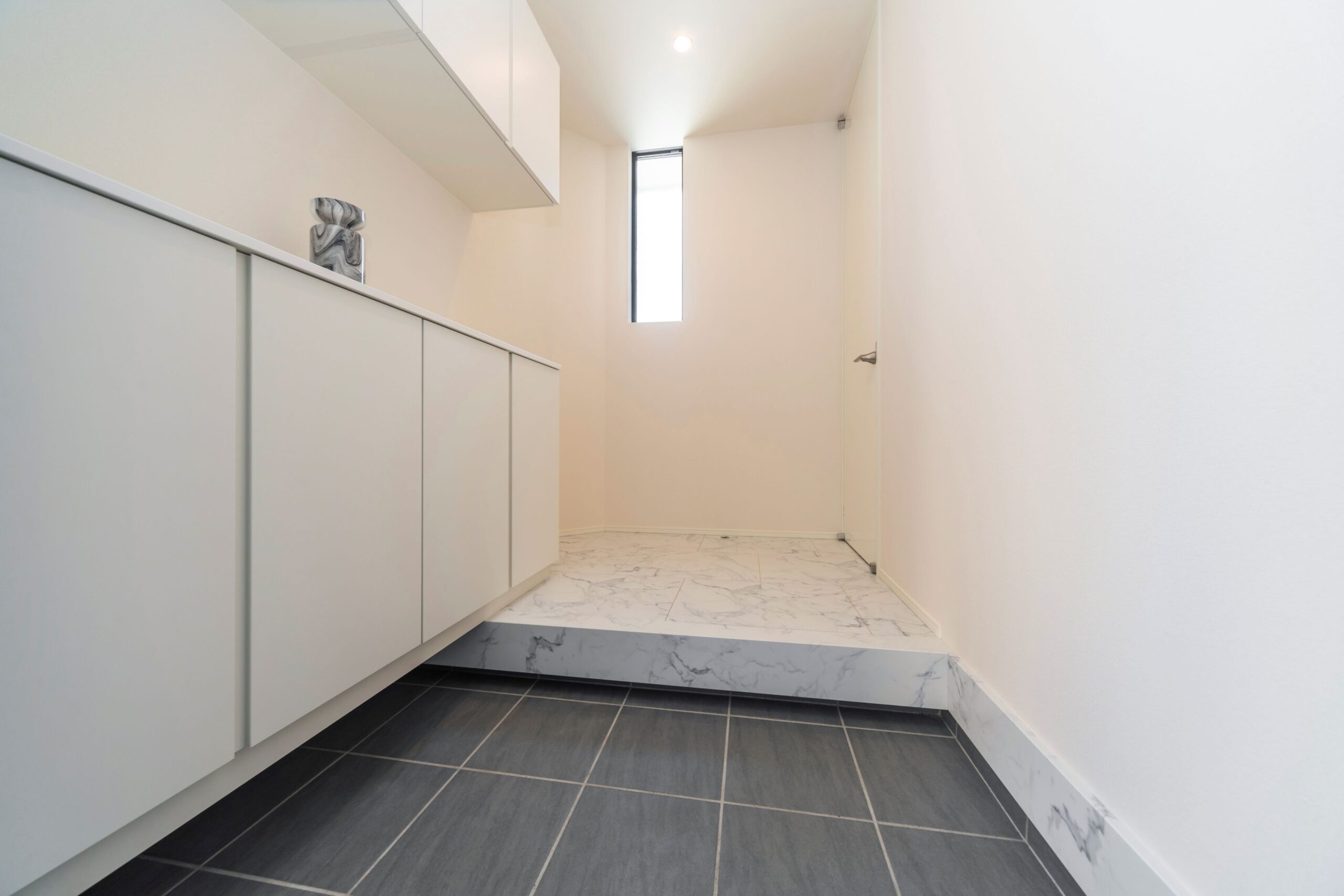 白を基調とした玄関。すっきりと清潔感のある印象に仕上がりました。