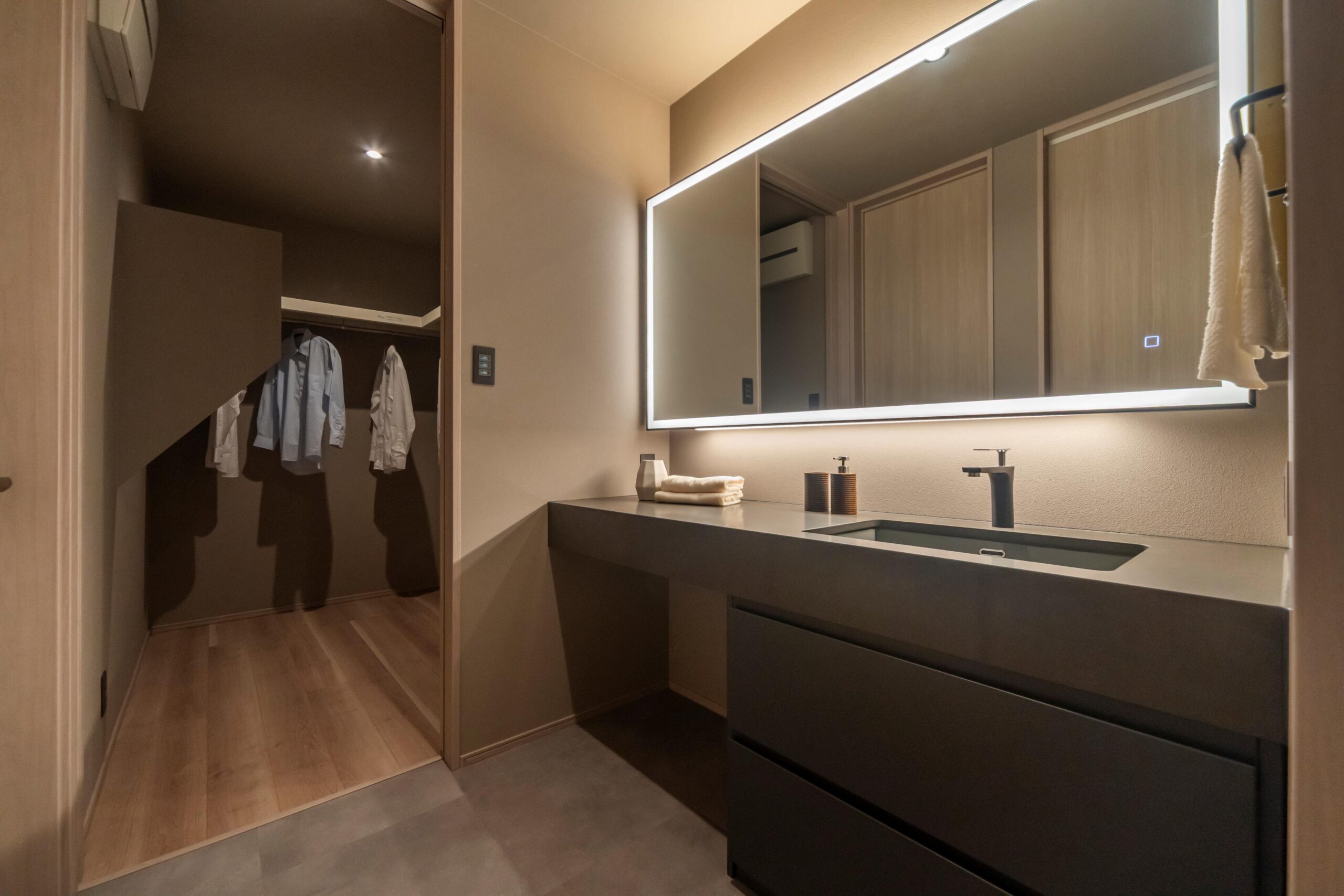 家のデザインに合った落ち着いた色味の造作洗面。隣にはウォークインクローゼットを設置しました。