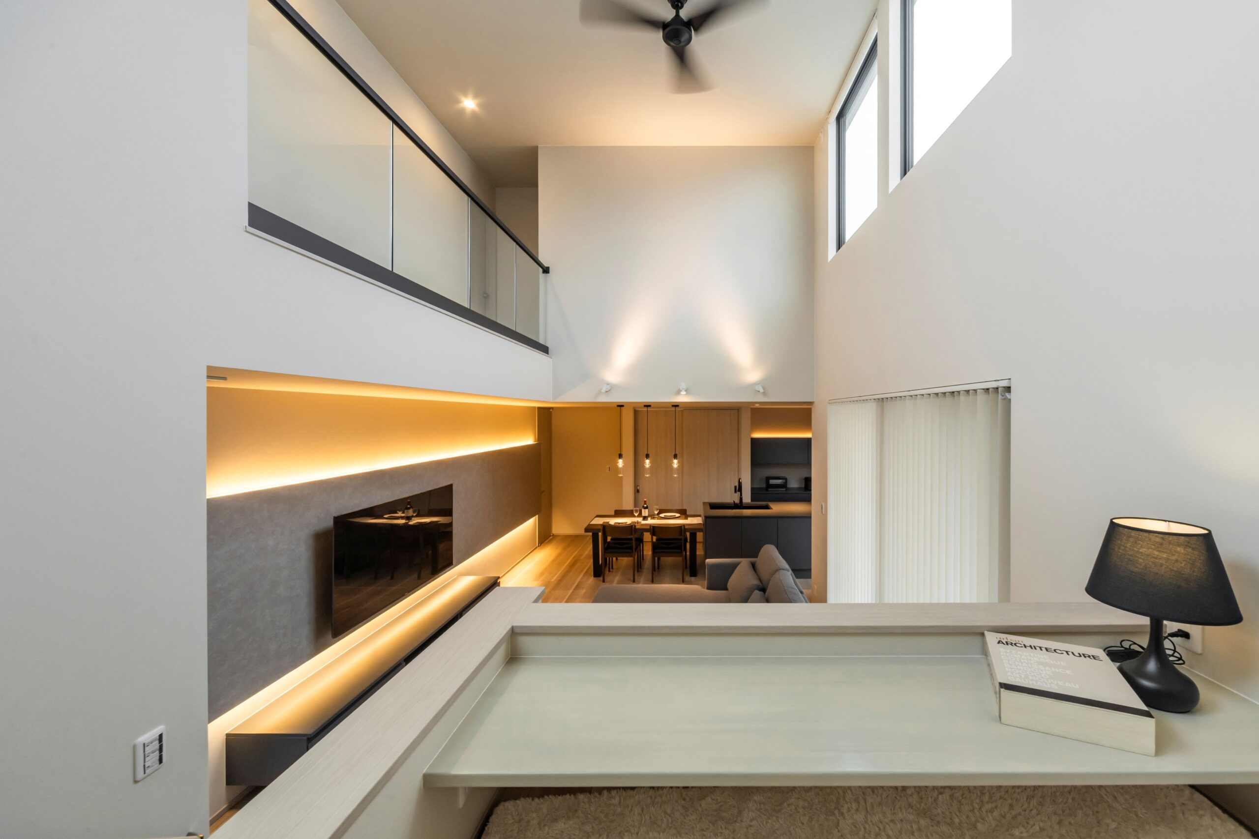 白・グレー・ベージュを基調としたシンプルモダンの家。光が差し込む吹き抜けやガラス手すりが洗練された空間を作りだします。随所に仕込んだ間接照明には暖色の明かりを使用することで、心落ち着く温かみのある家に仕上がりました。