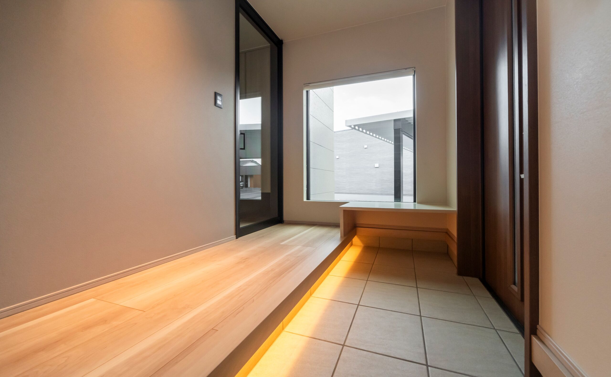 玄関には造作のベンチを設置しました。靴を履く際に腰かけたり、荷物を一時的に置いたり、暮らしが便利になる工夫です。